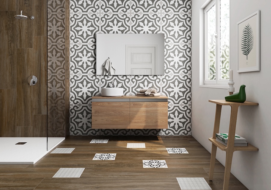 Havana encaustic-look porcelain tile delivers the charm of traditional cement patterns with the easy care of porcelain, making this feature wall a true focal point.