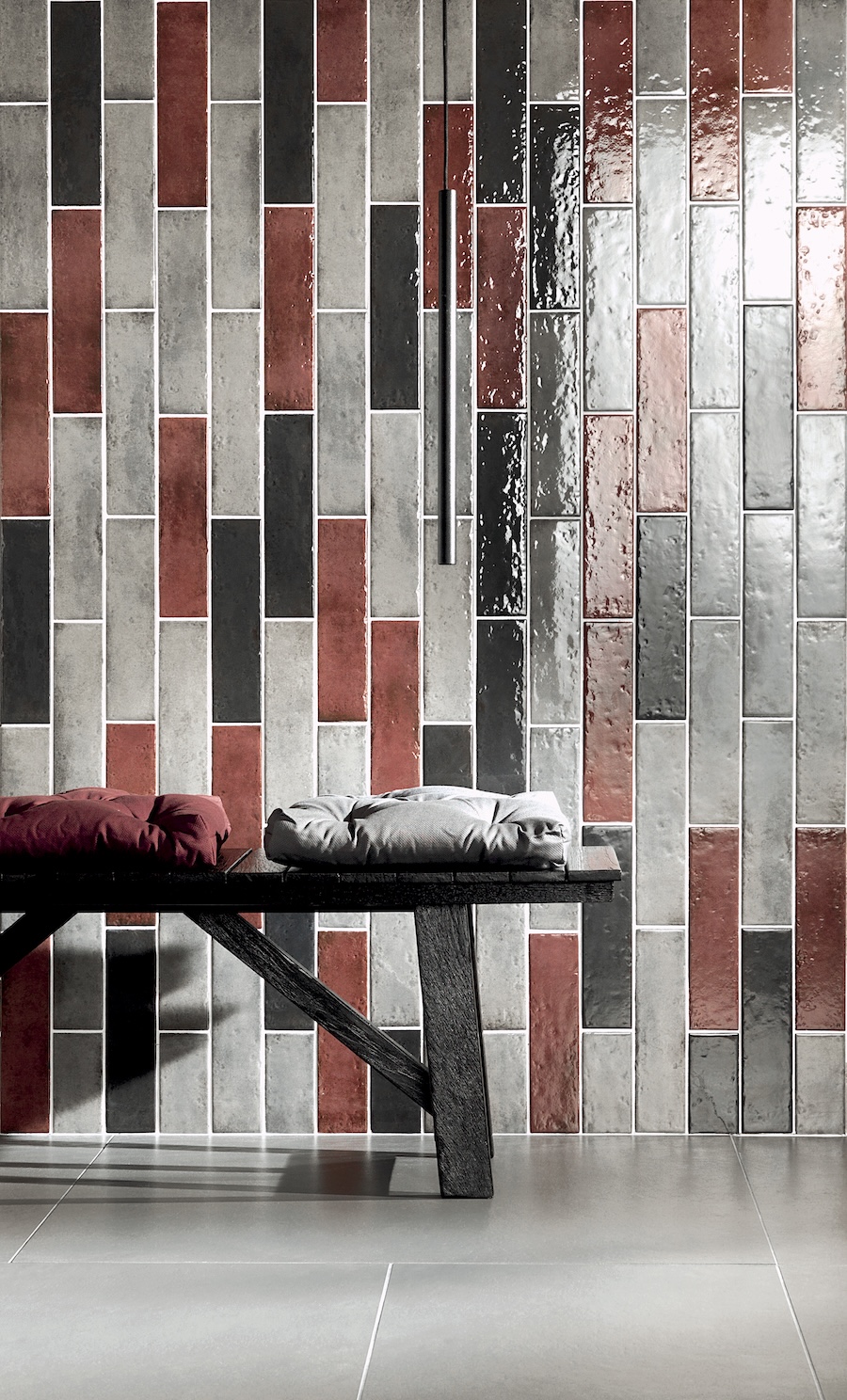 Richly varied glazes in Oxida porcelain tiles create vertical striping that feels raw, textural, and full of depth.