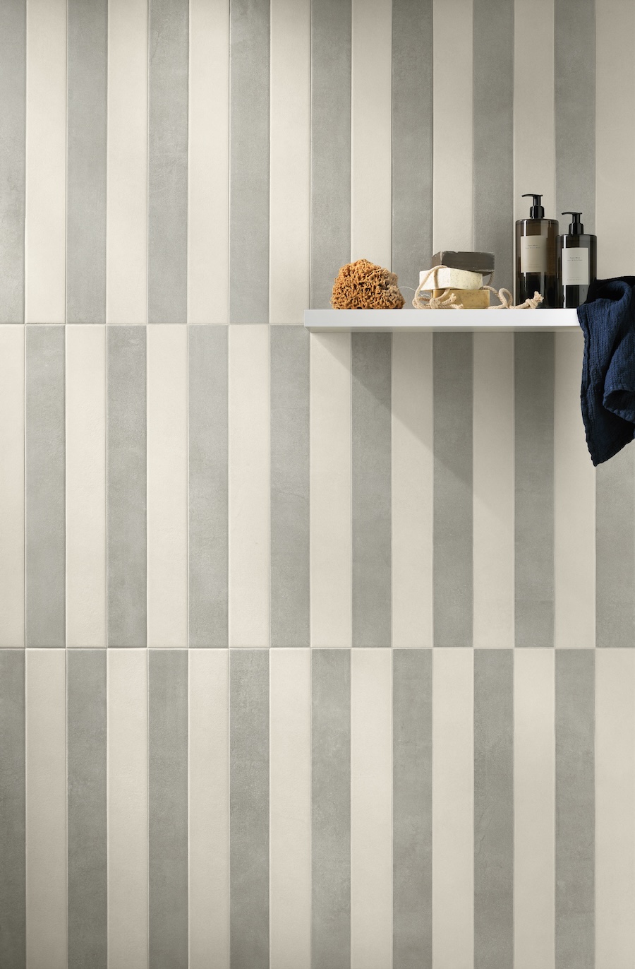 Offset and unexpected—Longarine Brio porcelain floor and wall tile gives stripes a modern remix with shifting bands of color.