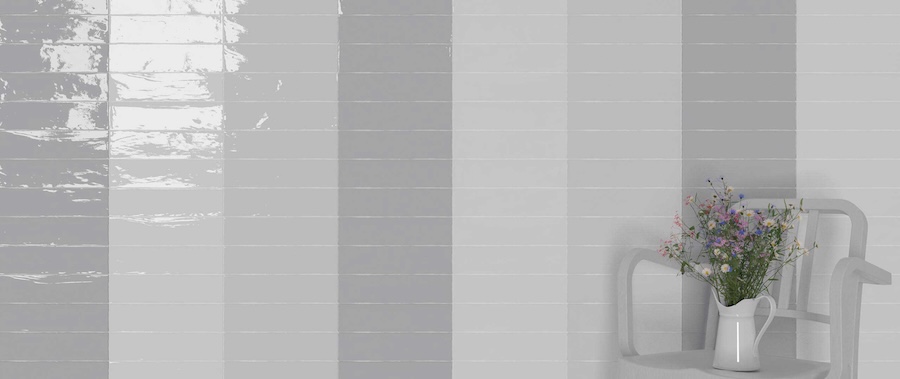 Shades of gray in a glossy finish in Crafted ceramic wall tiles form gentle vertical striping with an arsenal vibe and timeless appeal.