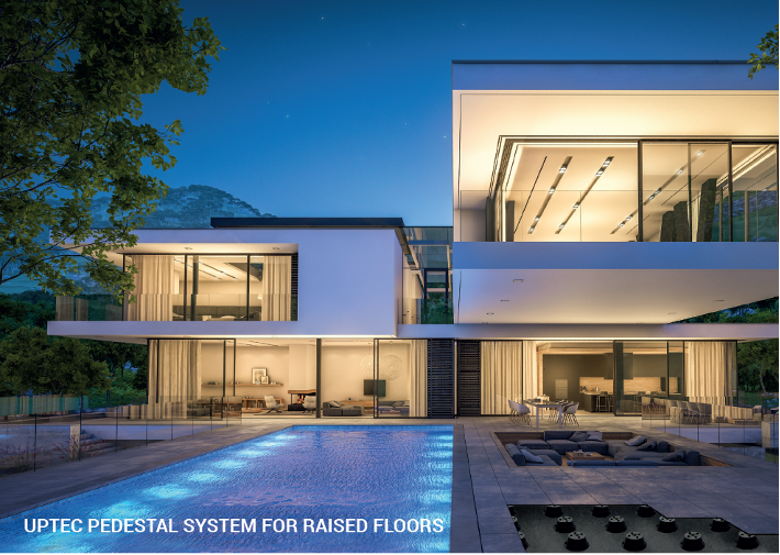 Uptec system consists of self-leveling and fixed head pedastals that are adjustable in height. Based on 3-in-1 concept, uptec includes 3 base items that minimize inventory levels. The uptec system can be assembled to any height and compensate for up to 5% slope of a structure's surface.