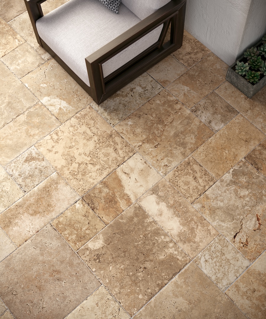 Aurum porcelain tile captures the warm, varied look of aged natural stone, shown here in a classic Versailles pattern for a timeless, old-world feel.
