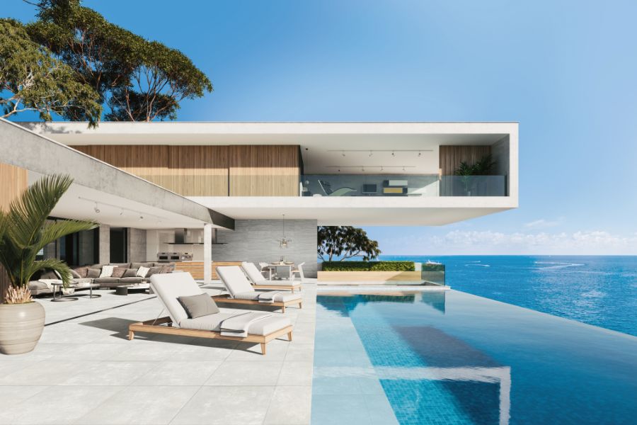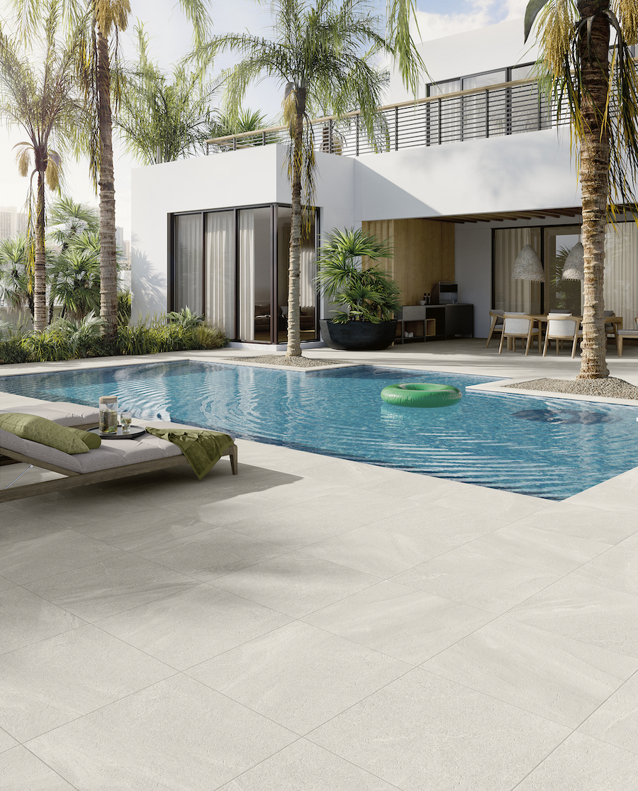Inspired by white marble, Portico Dream 2CM porcelain pavers deliver a chic metropolitan mood — ideal for creating sophisticated outdoor environments.