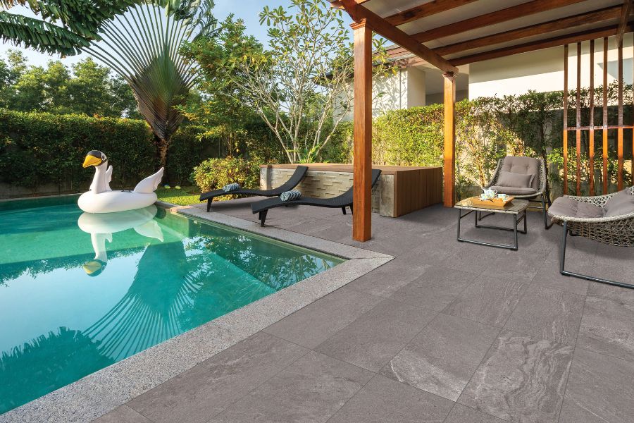 Taking its cues from the elegance of Italian Pietra di Cardosa and American Vermont Slate and merged with technical advancements, Owen Stone is a porcelain tile unlike any before. The exterior finish tiles in this collection are not only stunning but also have the durability and slip resistance necessary for poolside safety.